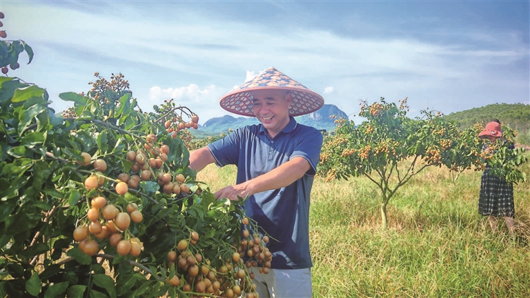 连日来,三五镇平塘村返乡创业者唐恩真种植的近30亩黑金刚黄皮果迎来收获,总产量1万多斤,按目前批发价5.3元/斤计算,产值达5万多元。图为唐恩真在采摘黄皮果。(龚银雪 摄)