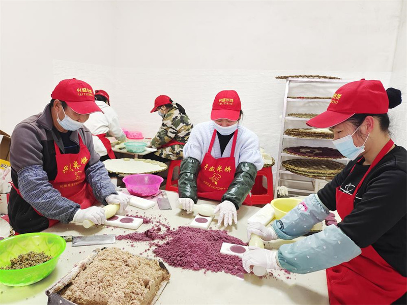 春节将至,年味渐浓。在武宣县东门塘市场的一家米饼店里,张学与10多名工人正忙着制作武宣米饼。据介绍,每逢腊月,武宣家家户户都会自制米饼供奉神明,祈祷风调雨顺。 “家人在武宣三里镇开作坊,我在市场现做现卖米饼也有5年了,淡季每天销量250~300公斤,旺季一天可以卖500公斤。”张学告诉记者,在武宣,过年的传统是打米饼,这是一件全家都能参与的活动,男女老幼围在一起,其乐融融,年味浓浓。“米饼寄托了武宣人对美好生活的追求,平时走亲访友都会互赠米饼,互送祝福。”他说。 米饼制作工艺繁杂,经过选米、泡米、晾米、炒米、打粉、煮糖、制馅料七道前期工序后,方可进行打饼等后续环节。张学店里的米饼采用传统纯手工制作,同时在传统米饼的基础上进行创新,米饼因使用原料不同,呈现出多种颜色,上面还有文字、笑脸等图案,深受消费者喜爱。 “这家米饼清甜幽香、细腻柔糯,我经常买,全家老少都喜欢吃。”前来购买米饼的张兰点赞道。 近年来,米饼逐渐发展成为武宣特色产业,并于2017年11月1日被列入武宣县第三批县级非物质文化遗产代表性项目名录,产品热销国内外。一批米饼作坊应运而生,产品在各类展会上亮相,深得商家和消费者青睐。米饼的销售渠道也由线下销售变为线上线下多渠道销售,消费者随时都可以选购。 “以前只有重大节日才能吃上米饼,现在老百姓的生活越过越好,米饼已成为武宣的一张特色名片。”张学说。小小的米饼,不仅带领本地群众奔小康,也给在外的游子送去家乡的温暖。