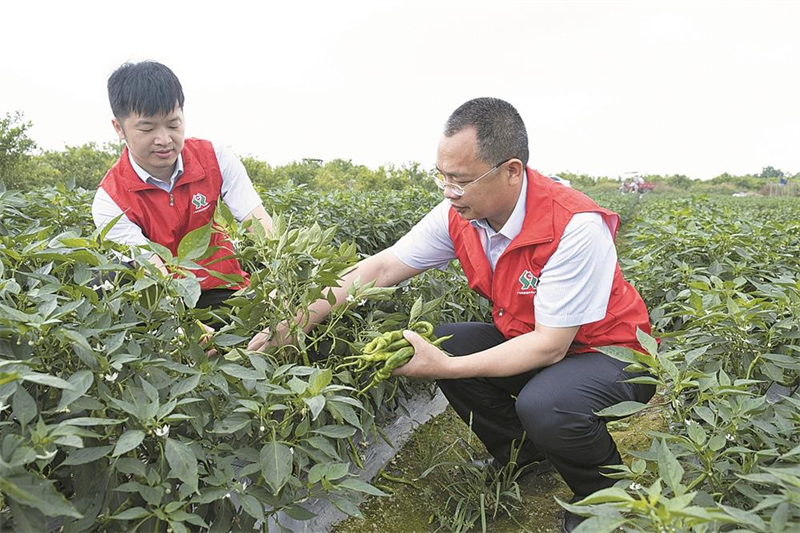 来宾农商银行的党员志愿者正在帮农户采摘辣椒。