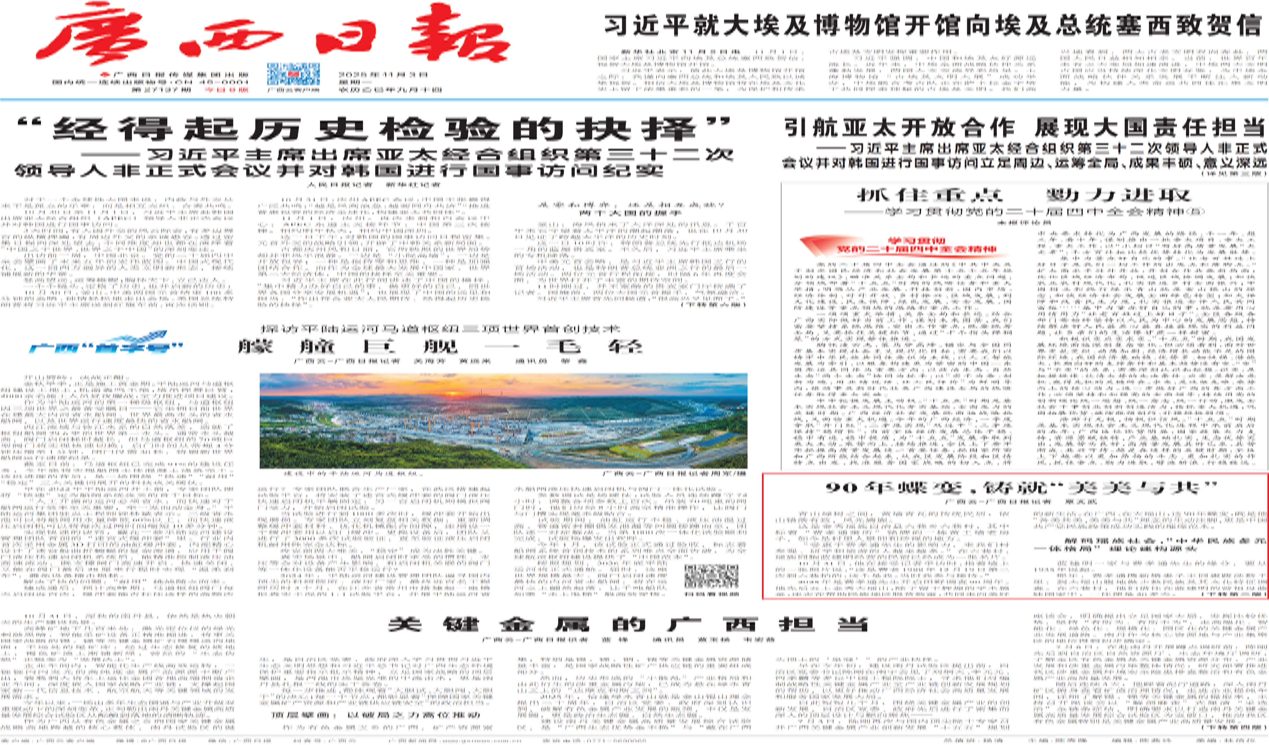 2025-11-05头版聚焦!11月3日《广西日报》重磅报道金秀费孝通五上大瑶山的90载深情回响,从学术深耕到发展破局再到跨域共富,以 “美美与共” 书写民族团结进步的鲜活答卷~ [详细]