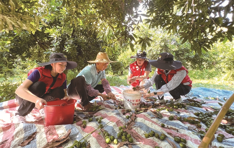 农技人员采摘坚果,为测产做准备。  眼下,合山市澳洲坚果陆续进入成熟采收期,一颗颗绿油油、圆溜溜的果实挂满枝头,一派丰收在望的喜人景象。近日,合山市农业农村和水利局联合各镇农业服务中心、澳洲坚果协会开展澳洲坚果测产工作,为产业发展精准“把脉”,助力提质增效。 9月18日,在合山市澳洲坚果庄园产业示范区,农技人员忙碌地采摘、称重、测量,详细记录品种、单株产量、种植时间等数据。广西乡村科技特派员李璐彦介绍,本次测产覆盖岭南镇、河里镇与北泗镇,除常规产量统计外,还包括坏果率排查和果实品质抽样检测,力求全面、真实反映今年合山澳洲坚果的实际产出水平。 澳洲坚果是合山市重点发展的特色产业。合山市通过“党建+林长制”、与科研院所合作等模式,大力发展澳洲坚果产业,目前种植面积达1.66万亩,累计带动2000多户农户发展坚果产业,年产值超亿元。“合山澳洲坚果”先后获评全国名特优新农产品、中国绿色食品A级产品。 为提升澳洲坚果的产量与品质,2023年,合山市与中国热带农业科学院南亚热带作物研究所建立科技合作,将合山澳洲坚果庄园确定为核心示范点,依托国家重点研发计划“热带木本油料作物绿色高效生产技术研究与示范”项目,深入开展“澳洲坚果绿色高效生产技术研究与集成示范”课题研究,通过引进优良品种,改良坚果土壤,推广滴灌、嫁接、无人机飞防与精准施肥等先进技术,推动坚果产业向标准化、优质化发展。 “我们重点进行土壤改良和平衡施肥,科学调控氮、磷、钾比例,补充中微量元素等。今天现场对两株样本进行测产,产量分别达到59.86公斤和60.31公斤,达到预期目标。”中国热带农业科学院南亚热带作物研究所陈菁博士介绍,经过实验,坚果单株产量明显提高,果实更加饱满。 今年以来,合山市通过实施“科技兴农”战略,构建“专家团队+科技特派员+示范农户”三级服务体系,围绕澳洲坚果、水稻种植、牛羊养殖等特色产业,采取分组结对、点对点服务方式,开展农技理论培训,深入田间地头指导、示范关键技术,帮助农户掌握科学种养水平,助推农业高质量发展。今年累计开展各类农技服务40余次。