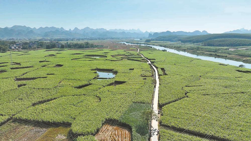 航拍范团村板寨黑果蔗园。 11月26日,走进城关镇范团村板寨屯的黑果蔗种植地,大片黑果蔗根根赛人高,蔗秆粗实,翠绿的蔗叶长得茂盛。田地里,农户忙着给甘蔗剥叶,露出黑亮亮的蔗身,再顺手把剥下来的叶子归拢到田边,地头里处处都是忙活的身影。 “现在剥叶是为了让甘蔗长得更高更甜。”村民梁桂芬手里攥着刚扯下的蔗叶说,她家今年种有5亩黑果蔗,从种下到现在,看着蔗苗一点点长到两米多高,心里甜滋滋的。 在板寨屯,像梁桂芬这样忙着管护黑果蔗的农户有100多户,全村黑果蔗种植面积近1000亩。当前正值黑果蔗管护关键期,农户用心照料每一根甘蔗,为即将到来的丰收做足准备,让这黑亮亮的果蔗变成实实在在的收益。 “黑果蔗是我们村的特色产业,从今年3月前后下种到11月进入管护期,平时我们也会帮农户对接农技站,指导大家做好田间管理,确保果蔗长势良好。”范团村村民委员会副主任樊俊利介绍,往年黑果蔗亩产约7吨,优质田块能达到8吨,脆甜的品质很受收购商青睐。