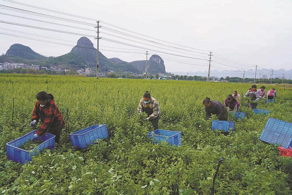 近日,城关镇交椅村100亩枸杞菜基地迎来产销旺季。连片种植的基地里,工人们俯身其间,手持工具精准割下鲜嫩的叶梢,随手放入身旁的塑料筐(如图)。不一会儿,筐里便堆起一座座“绿色小山”。 满筐的菜被迅速盖上保鲜布,搬至田边三轮车,运往仓库分拣、捆扎、包装,随后装车外运。高效有序的采收节奏,源于枸杞菜易管护、采收周期灵活的品种优势。“夏天一个多月就可以采收一批,冷天长得慢,两个月收一次。枸杞菜易管理,基本没有病虫害。收割后用割草机把剩下的菜秆割平,很快又会重新长出新苗。”该基地负责人罗双胜介绍。 稳定的产量和标准化管护,让交椅村的枸杞菜在市场上站稳了脚跟。“一天可采摘枸杞菜1000多斤,收购价跟随市场变化,一斤4元至6元。”罗双胜说,基地采用露天种植模式,全程遵循绿色管护标准,具备自动喷淋、水肥一体化灌溉,采摘的枸杞菜主要销往南宁。 从田间采摘到装车外运,产销链条顺畅运转。这一株株不起眼的枸杞菜,不仅撑起了种植户的增收希望,更让灵活就业的村民多了一份稳定收入。“年纪大了,辛苦的活我做不来,来这里割枸杞菜比较轻松,最近天天都来。”正在采摘枸杞菜的工人蓝小叶说。 采收不停,销路不愁。交椅村的枸杞菜种植以“短平快”的产业优势,实现了产销两旺。这片生机勃勃的菜园,不仅丰富了城市的菜篮子,更鼓起了村民的钱袋子,为当地乡村振兴注入了鲜活的产业动能。