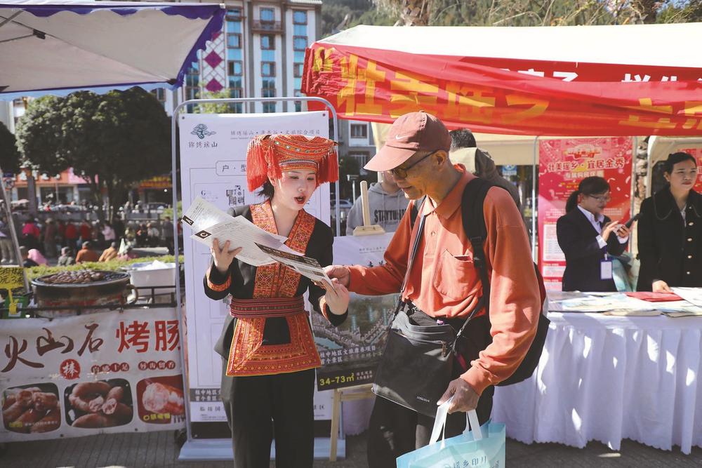 金秀活动现场,销售人员向游客讲解房型。 来宾网-来宾日报讯 (记者 徐圆圆 通讯员 樊又祯 廖玲平 文/图) 12月6日、7日,由市住房和城乡建设局主办的“好房子·悦生活”系列住房促消费活动走进金秀、忻城,活动现场汇聚了多家房企,推出面向不同群体的优惠房源,为当地居民与返乡人群提供了集中的看房选房平台。 12月6日,金秀瑶族自治县的瑶都广场上,2025年盘王节正热闹举行。一场以“好房子·悦生活”——“壮美瑶乡·宜居来宾”为主题的购房优惠活动在此同步开展。活动现场,多家品牌房企展示了多类型优质项目,其中有广西融安易通鹏程府、广西裕达集团圣堂雅苑等。针对不同群体的居住需求,房企推出了涵盖精致小户型、舒适改善型等多种产品,所有户型注重居住品质与实用性,并且总体价格相对较低,减轻了购房的经济压力,为返乡人员、青年教师、医护人员及游客等提供真正“住得舒心、生活便利”的安居选择。 12月7日,忻城县中心文化广场上人头攒动,一场以“好房子·悦生活”——“锦绣壮乡·宜居忻城”为主题的购房优惠活动在此开展。活动现场,中央城、熙龙湾小区、庆南府等忻城县的房地产项目集中亮相,推出的房源类型多样,涵盖刚需小户型、改善型大户型等多种产品类型,并搭配了购房打折、赠送家电等购房优惠措施。此次活动采用了“文旅+安居”的融合思路,借助忻城县中心文化广场的人流与便民属性,将购房咨询、政策解读等安居服务送至居民身边,旨在让更多人在感受忻城独特魅力的同时,了解到当前的宜居政策与市场情况,帮助有需求的群体更直观、便利地了解市场信息与优惠措施。
