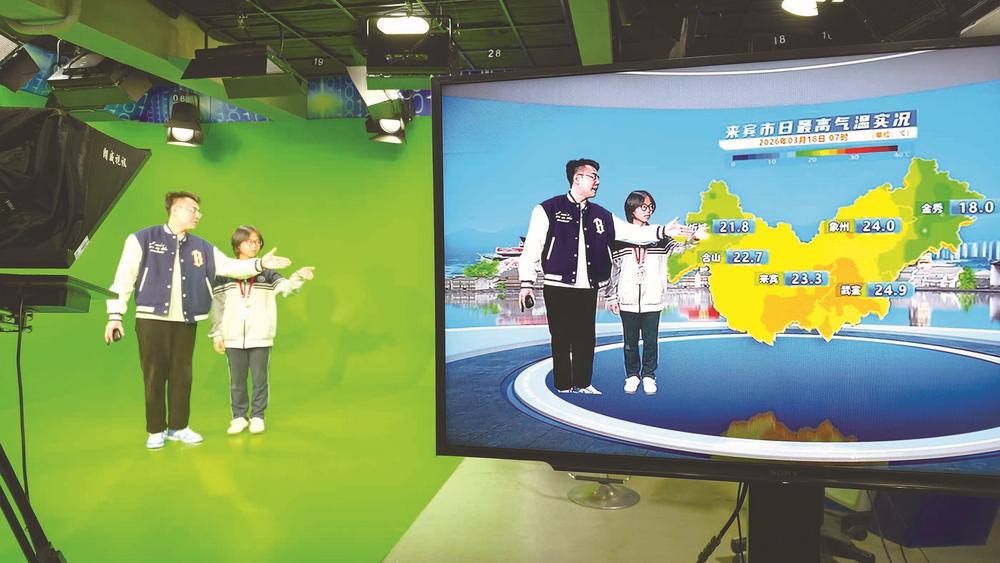 学生在体验天气播报。 来宾网-来宾日报讯 (记者 覃 威 见习记者 李婧雯 通讯员 鄢大川 文/图) 3月18日,在第66个世界气象日到来之际,市气象局举办“测今日气象 护明日家园”主题开放日活动。来自来宾市第六中学、来宾市实验学校、来宾高级中学的140余名师生走进气象部门,“零距离”了解气象科学工作,在生动有趣的科普体验中加深对气象知识及气候变化的认知。 活动现场,在志愿者的耐心指引和悉心讲解下,师生们依次参观人工影响天气展点、移动气象站展点、科普展厅等区域,亲身感受气象科学发展历程。各参观点设置趣味问答环节,围绕气象观测工具、预警信号等内容进行提问,学生们踊跃抢答。“我今天认识了很多测量工具,例如百叶箱、风向标和雨量桶。”市第六中学学生吴煜轩说,趣味问答让气象知识变得生动易懂,自己对防灾减灾的重要性也有了更直观的认识。 此次活动将气象科普与互动体验相结合,帮助青少年走出课堂,在实践中探索气象奥秘,进一步拓宽知识视野、激发科学梦想,增强气象防灾减灾意识,为共建人与自然和谐共生的美好家园注入青春力量。市气象局副局长吴凤莹表示,未来将持续开展此类科普活动,引导公众尤其是青少年关心气象、了解气象,树立守护生态家园的责任意识。