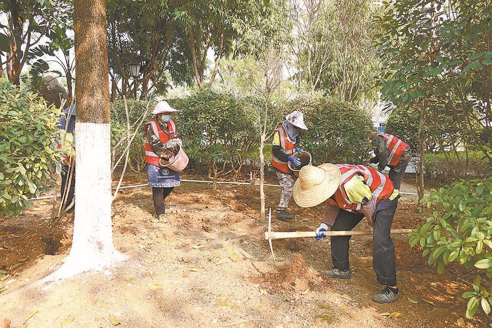 园林工人给苗木施肥。 来宾网-来宾日报讯 (记者 罗倩尹 文/图) 3月30日,市城市管理局组织开展市城区绿化苗木春季施肥工作,为苗木补充“营养”。 在盘古公园,园林工人正抢抓雨后土壤湿润、养分易吸收的有利时机,在苗木根部周边挖坑、撒肥、覆土,全面推进城区绿化施肥工作。 据悉,此次施肥范围覆盖市城区道路附属绿地,包括城北片区、城南片区、华侨片区,以及金海公园、人民公园等6个公园,市民健身步道、来宾大道两侧景观带和桂中水城等各类公共绿地,总施肥面积约450万平方米。 “春季施肥可促进苗木提早返青、枝繁叶茂,增强长势和病虫害抵抗力,为全年城市绿化景观筑牢基础。”来宾市园林管理中心公园管理科负责人刘敬宝介绍,此次预计施放复合肥、有机肥、磷钾肥等各类肥料约800吨,通过科学养护保障苗木健康生长,进一步提升城市绿化品质,为市民营造优美宜居的生活环境。 此外,市园林管理中心同步推进城区道路、公园树木绿化修剪工作,组织人员重点修剪枯枝、病枝及遮挡交通标识、影响通行安全的枝条。 近年来,市城市管理局深耕城市绿化养护工作,不断优化城市生态底蕴,推动市建成区绿地率、绿化覆盖率、人均公园面积三大核心指标稳步提升。截至2025年底,建成区绿地率达35.77%、绿化覆盖率42.47%、人均公园绿地面积13.24平方米,较2021年分别提升1.99个百分点、2.47个百分点和1.26平方米,市城区“推窗见绿、出门入园”已然成为市民生活常态。
