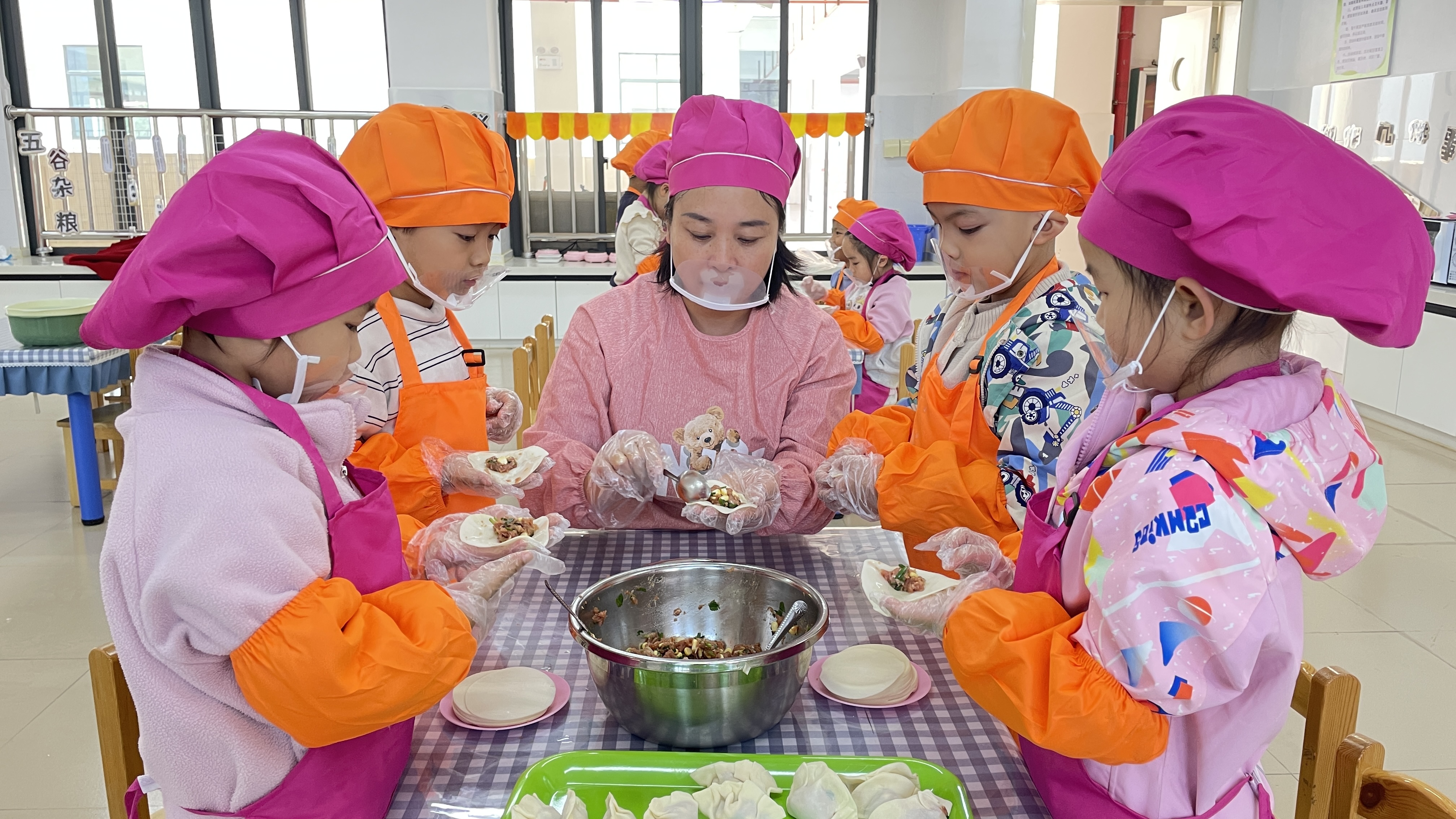 12月18日,来宾市第二实验幼儿园组织开展“冬至童趣 饺香满园”包饺子活动,孩子们在包饺子、煮饺子、品饺子等过程中感受传统节气的魅力,在热气腾腾的实践中增强文化认同感、提升劳动技能。图为教师指导孩子们包饺子。 (刘 艳 摄)