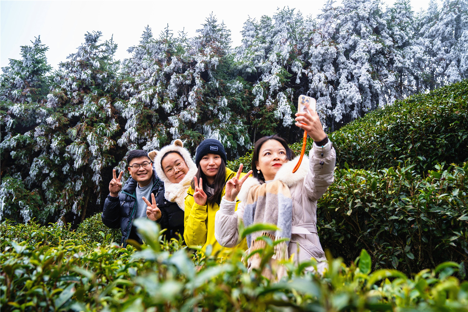 1月23日,游客在金秀瑶族自治县金秀镇六段村高山生态茶园游玩、拍照打卡。